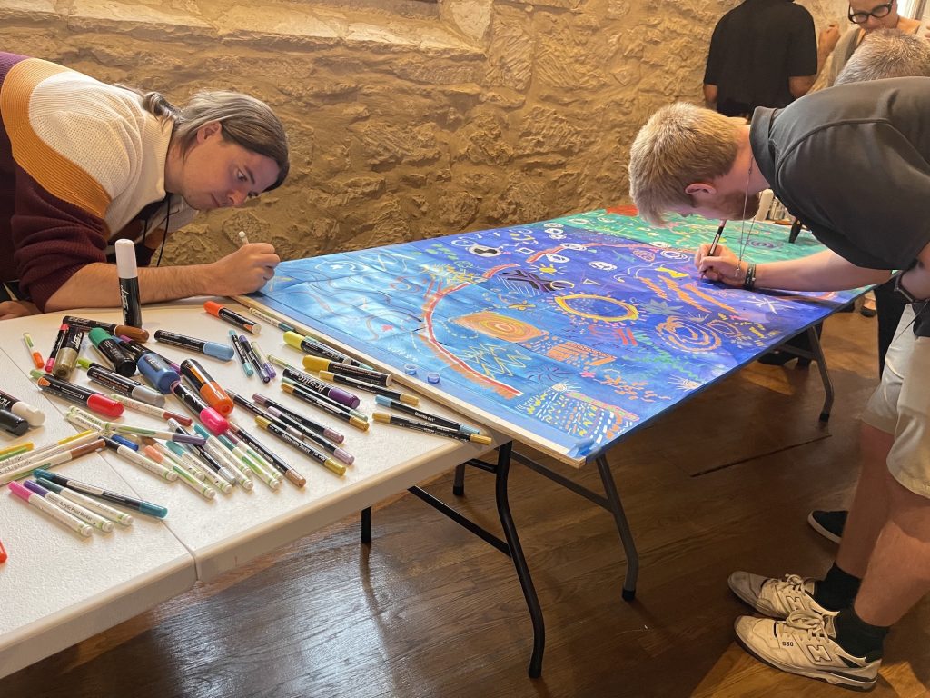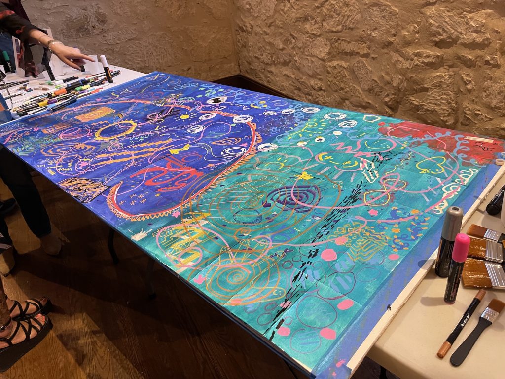 When I came back an hour later, the canvas had taken on a new life. Not just more color, more texture, more movement (though it had all of that), but a different kind of life: the life of something no longer dependent on me. Someone I’d guided had become the guide for someone else. A small, practical explanation had turned into a living game of telephone, with visual messages passed from participant to participant with an ease that felt familiar despite this being the inaugural run. The activity was teaching itself.