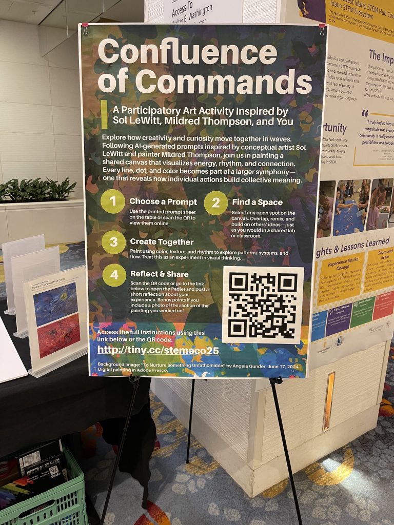 That’s why Confluence of Commands often includes an invited interlocutor, an artist whose questions can sit with us as we paint. When I brought Mildred Thompson into the first several iterations of this activity, I wasn’t asking participants to imitate her aesthetic. I was inviting her conversation, her way of holding art and science together, into the room. The canvas became a dialogue not only among participants, but also with her work, her inquiry, and the larger set of questions she was already asking through paint.